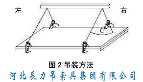 3.1 PDK鉗的基本使用方法如圖2所示,通過橫梁連接,組成兩隊PDK鉗。特別提示:PDK鉗的安全工作載荷是指一對(兩只)PDK鉗的載荷;起吊鋼板厚度是指PDK鉗安全起吊鋼板的厚度范圍,PDK鉗的實際開口度應大于鋼板的厚度。吊裝前必須首先檢查鋼板的重量和板厚是否與PDK鉗匹配。頂部夾角α不得大于120°,一般控制在90°以內,所有鋼絲繩的適用方向與橫梁左右垂直。